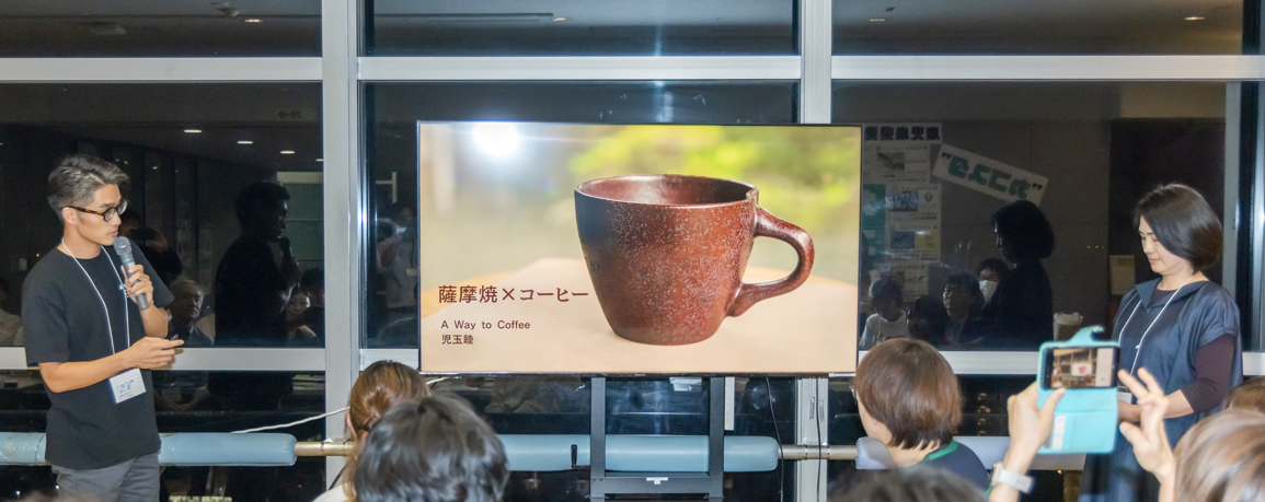 最後に、昨年度のかごチャレで生まれた“出会い”からはじまった取組みが紹介されました。400年以上の歴史を持つ薩摩焼・荒木陶窯さんと、鹿児島発・移動式スペシャルティコーヒーの販売に取り組むA Way to Coffee の児玉さんによる事業コラボレーションです。コーヒー粕を釉薬に混ぜ、薩摩焼の色づけに活かすという前例のない試み。試作段階の作品が映し出されると、会場ではざわめきが広がりました。この場の出会いから想いがつながり、確かな形として芽を出す——そのプロセスに共感するとともに、未来への期待がふくらみます。